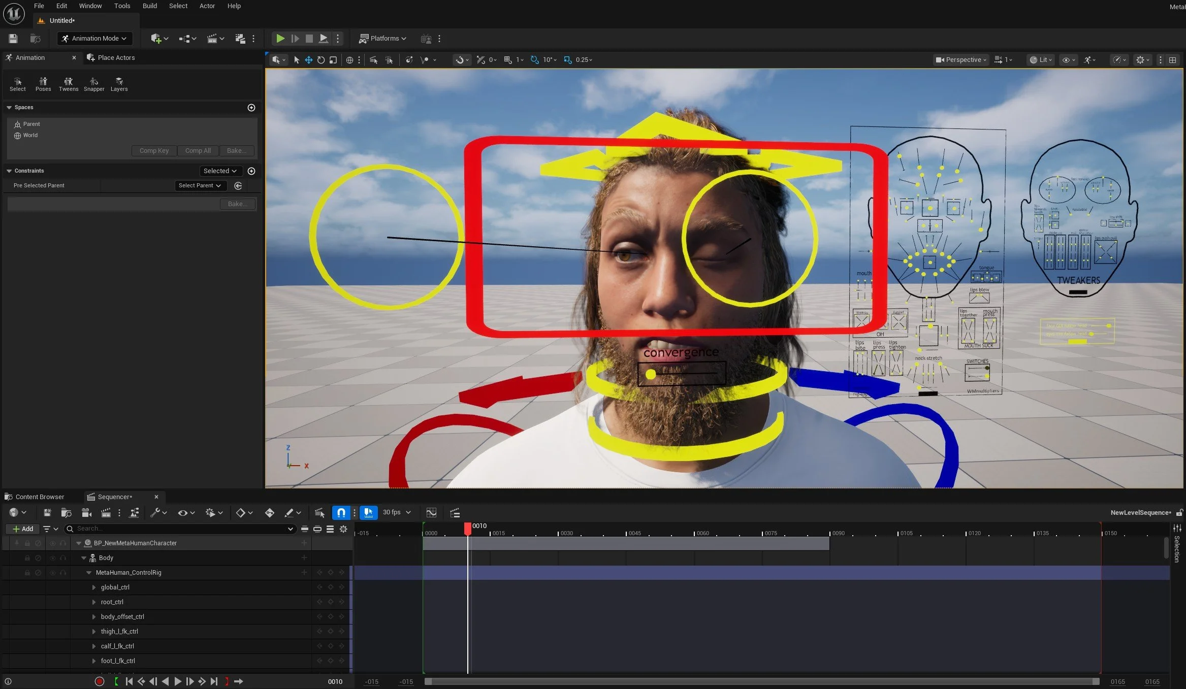 Step 4: This will add a control rig panel to the viewport, alongside showing all of the metahuman attributes we can keyframe. You can also LMB click on the yellow control sliders to adjust the various properties.