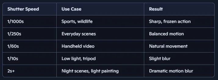 Slow shutter: Ideal for artistic blur — light trails, waterfalls, or dreamy movement.