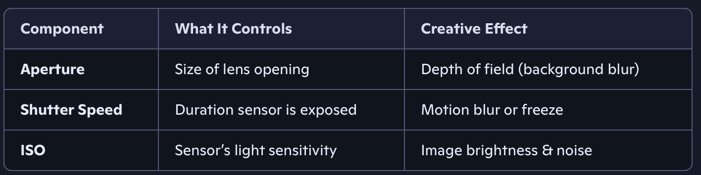 The exposure triangle is the foundation of photography—it’s the relationship between three key settings that control how light interacts with your camera: aperture, shutter speed, and ISO. Mastering this triangle lets you take well-exposed photos in any lighting condition and gives you creative control over how your images look.