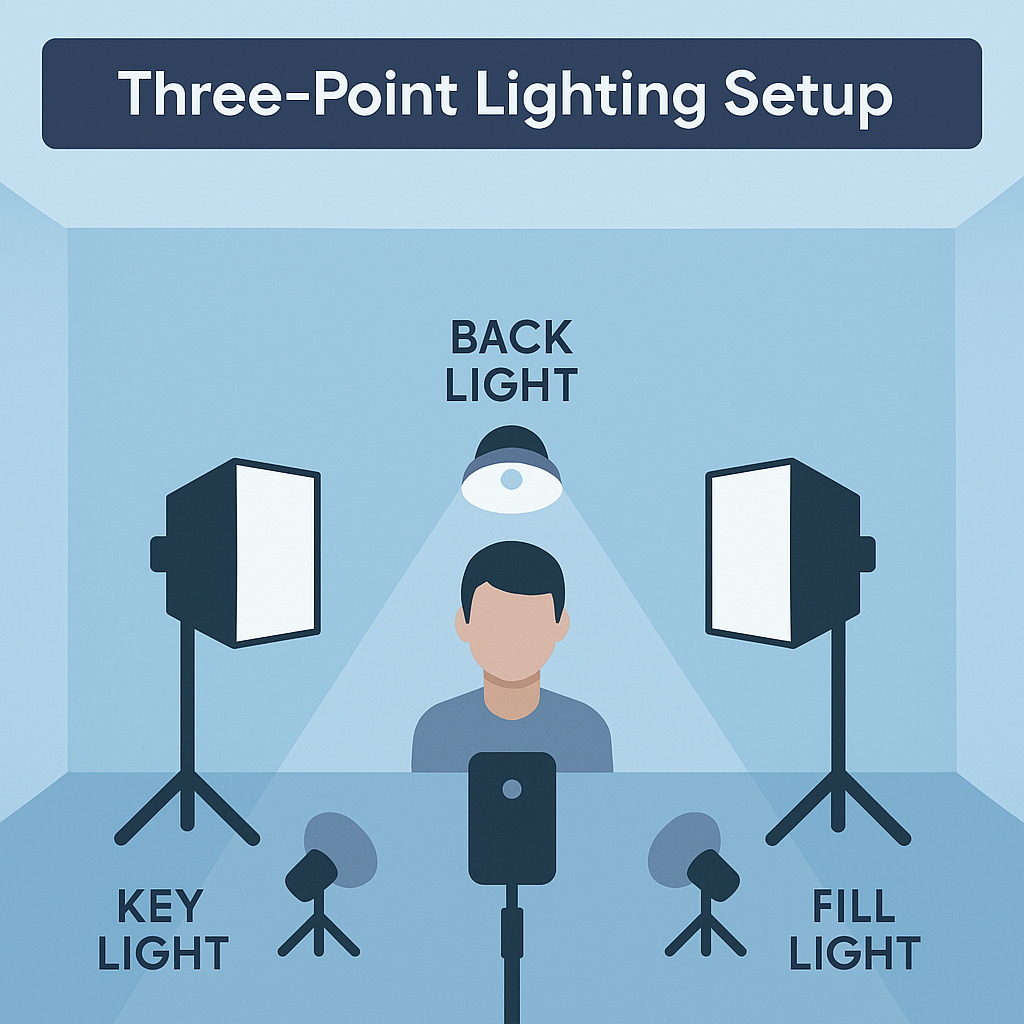 Fill Light: Softens shadows created by the key light, placed opposite the key.