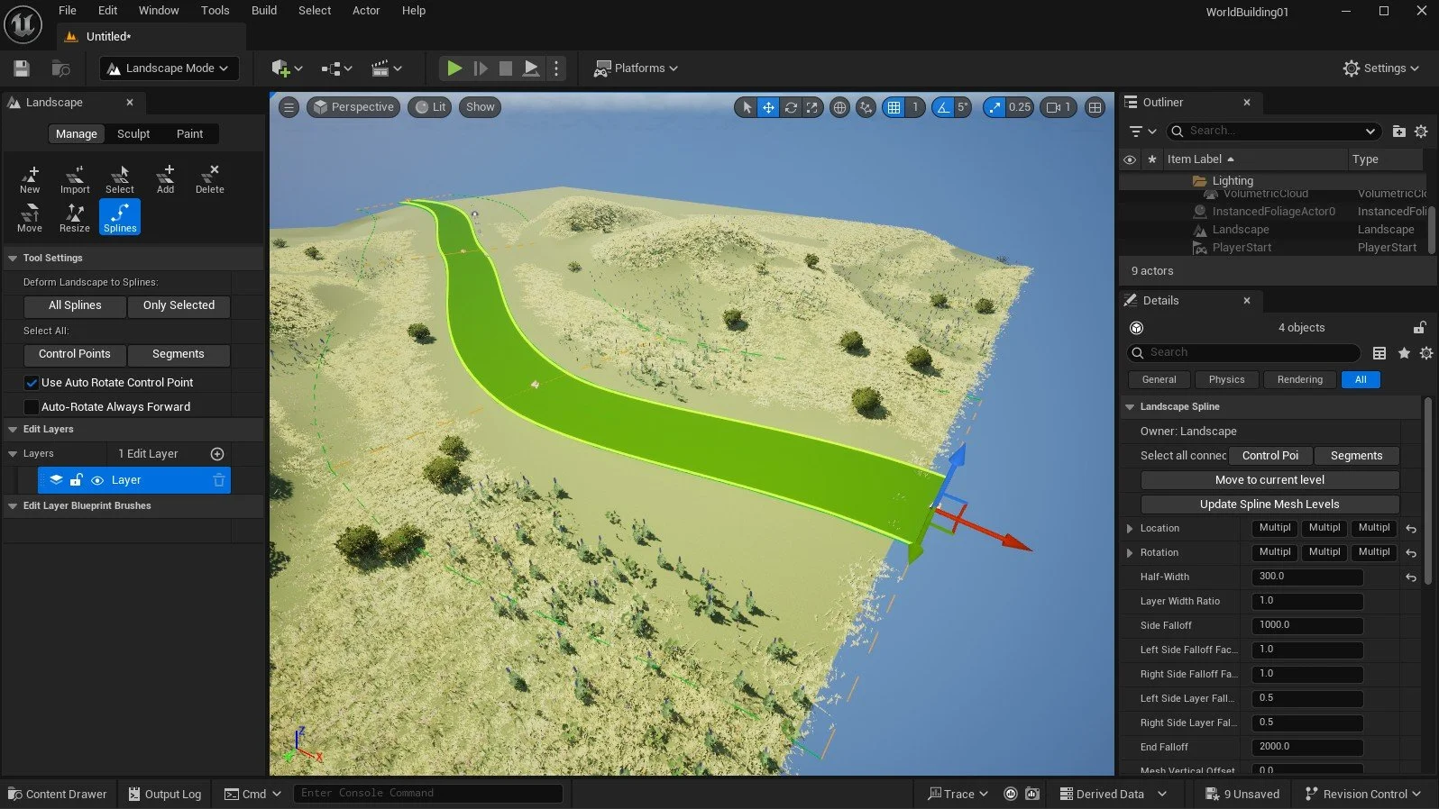 We can use Splines, a tool we will explore further in Blueprints workshops to shape the landscape. This can be useful when carving riverways, building roads that level terrain and otherwise creating paths through the landscape.